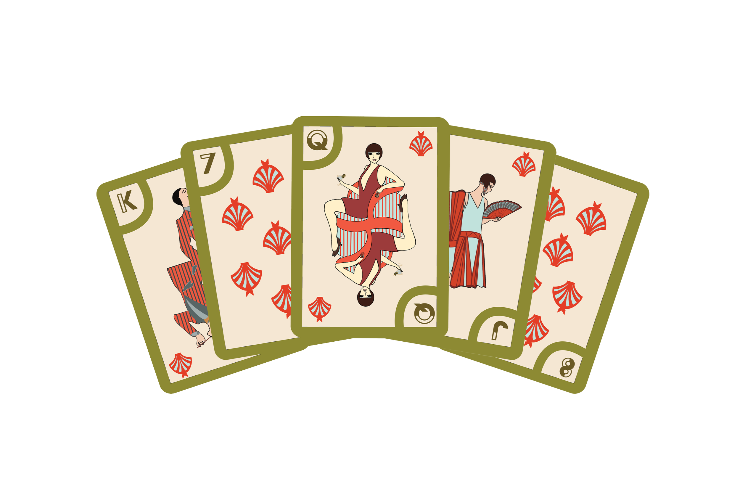 Art Deco influences are evident in the typography, color scheme, and illustration style, creating a deck that stays true to the movement’s bold and structured aesthetic.