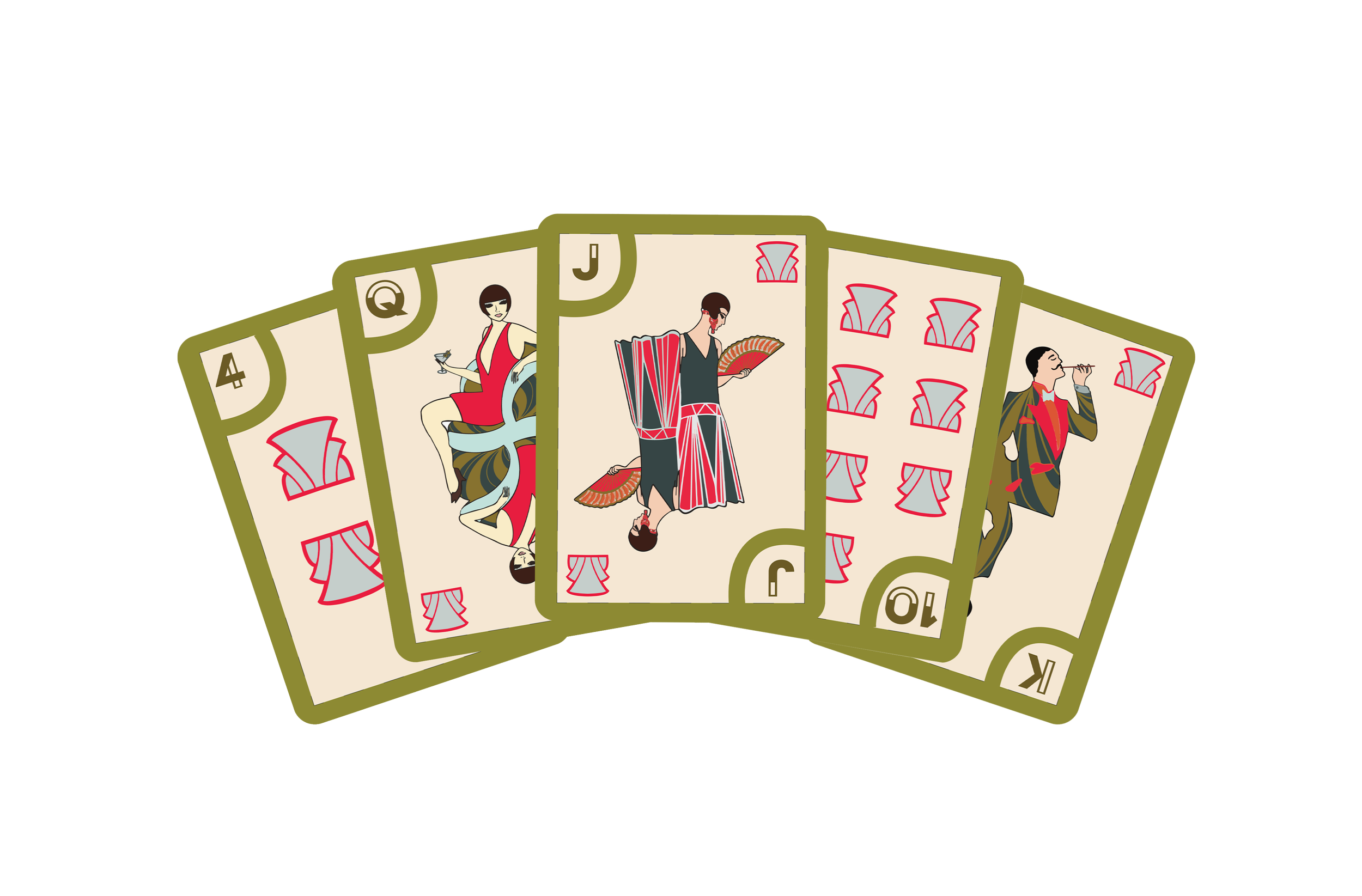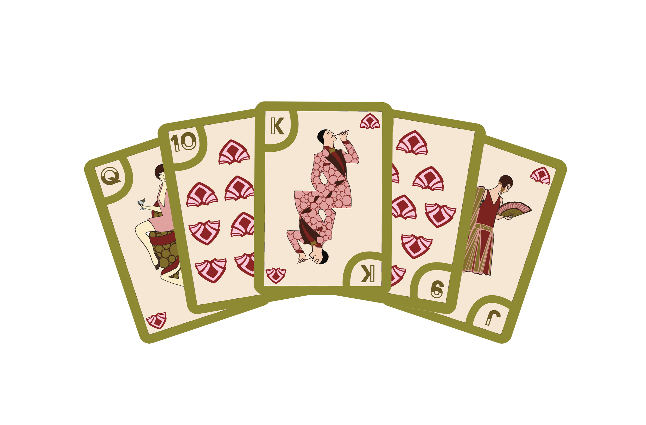 This custom 52-card deck is inspired by the Art Deco movement, with every element, except for the typography, hand-drawn. The four suits and illustrations for the Ace, Jack, Queen, and King were designed to reflect the era’s geometric style. The back of the cards features a hand-drawn pattern that also appears on the box for a cohesive design.