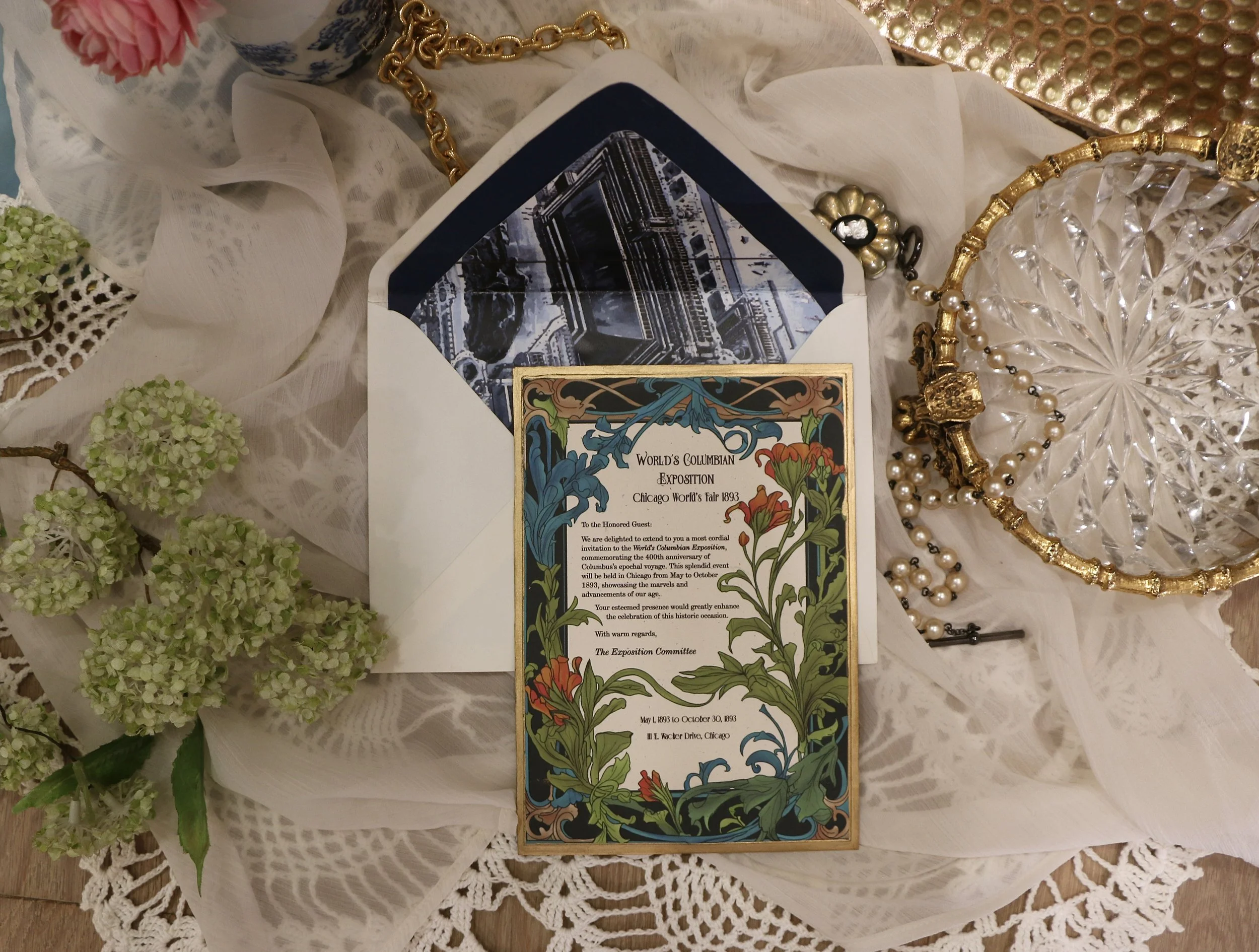 For this project, I was tasked with designing a historical invitation suite and chose the 1893 Chicago World’s Fair (World’s Columbian Exposition) as my inspiration. The art nouveau aesthetics of the era, along with its intricate typography, bold color schemes, and ornate floral patterns, guided my design and illustration choices. I drew inspiration from these elements to create a suite that felt both authentic and visually compelling.