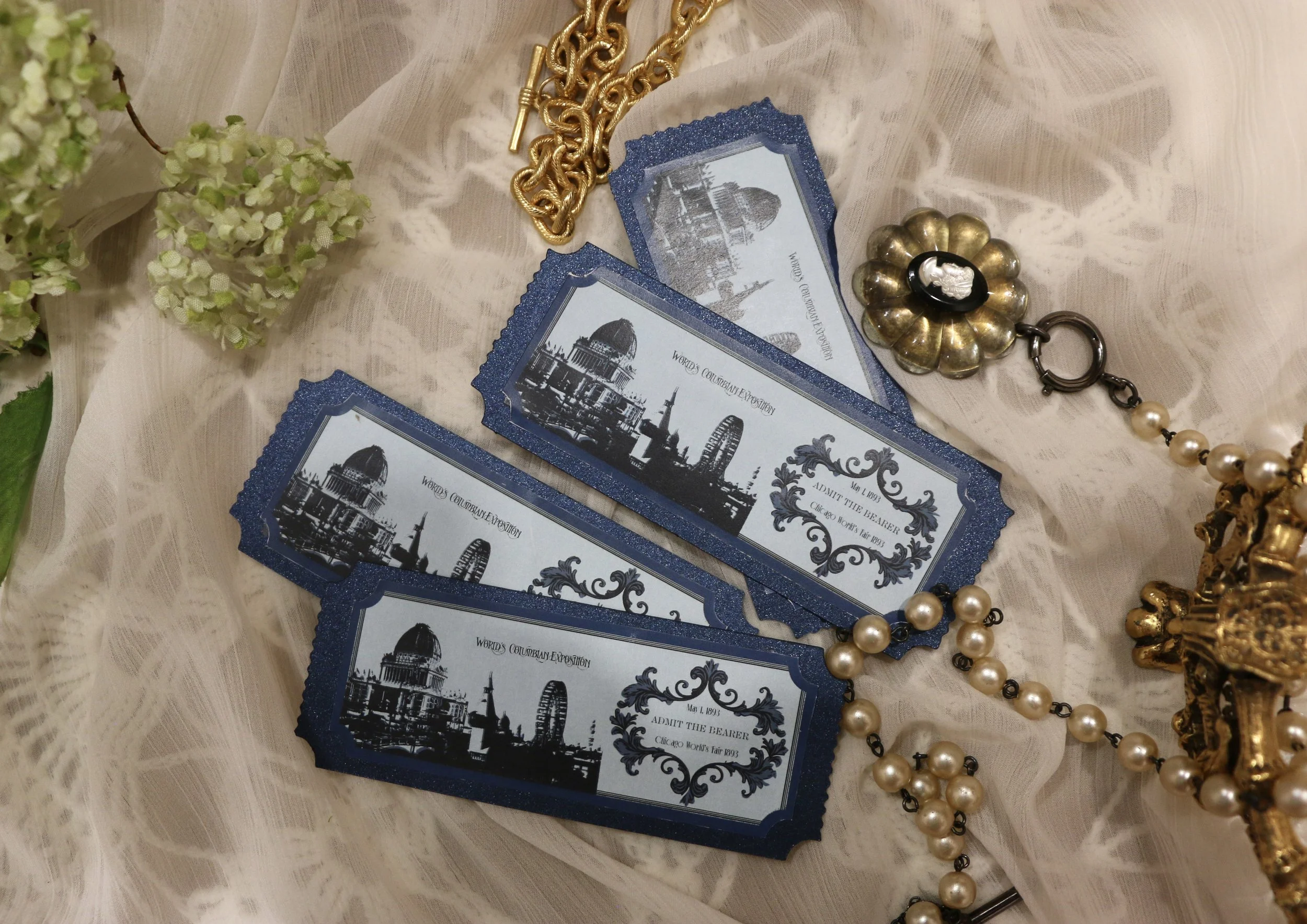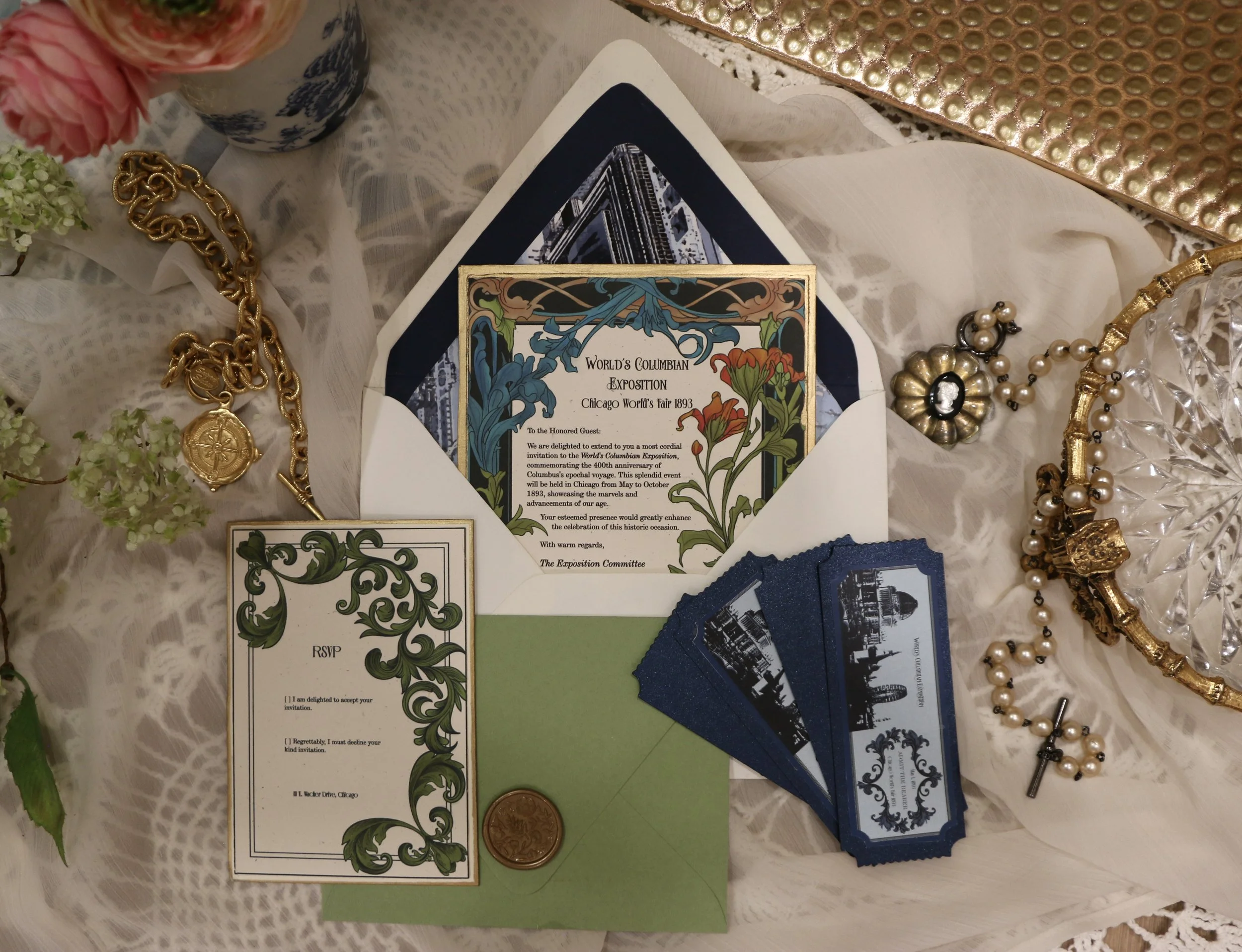 The suite includes an envelope, an invitation, an RSVP card and envelope, and four general admission tickets to the fair. The outer white baronial style envelope has an interior sleeve showcasing a rough aerial view of the fairgrounds with a navy border. The invitation and RSVP card both have matching patterned backs and gold foiled edges. There is also a smaller olive green envelope for the RSVP to be mailed back and four general admission tickets to the fair include small illustrations of the Chicago skyline. Every aspect of this suite was handcrafted, ensuring a tactile and immersive experience reflective of the grandeur of the Chicago World’s Fair.